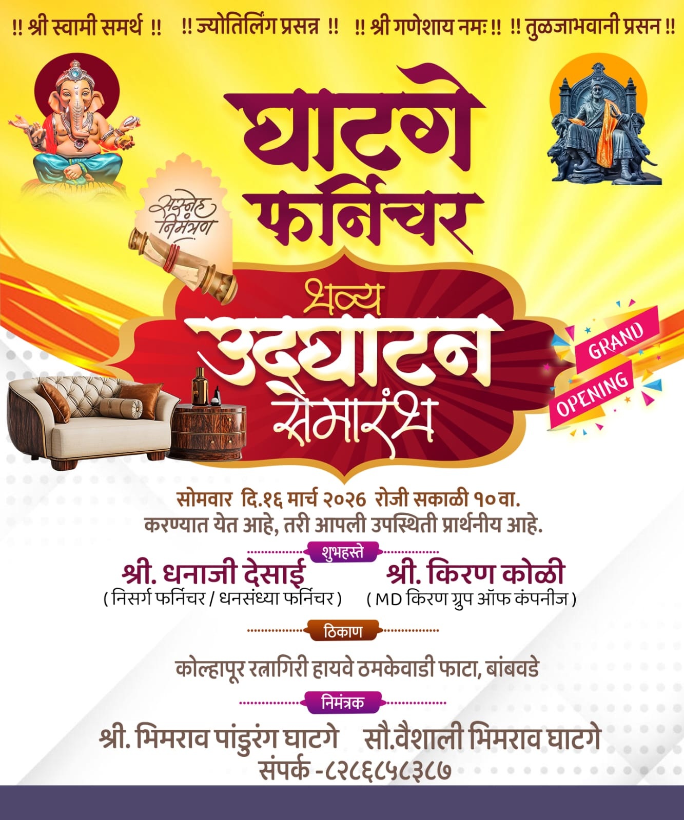 बांबवडे : गोगवे पैकी ठमकेवाडी तालुका शाहुवाडी इथं “ घाटगे फर्निचर ” या फर्निचर दालनाचे भव्य उद्घाटन उद्या दि.१६ मार्च २०२६ रोजी सकाळी १०.०० वा. होत आहे. या उद्घाटन सोहळ्यास तालुकावासियांनी भेट द्यावी, सदर चे उद्घाटन ठमकेवाडी (गोगवे पैकी )फाटा बांबवडे,रत्नागिरी-कोल्हापूर रोड इथं संपन्न होणार आहे. असे आवाहन श्री भीमराव पांडुरंग घाटगे राहणार सैदापूर तालुका शाहुवाडी यांनी केले आहे.