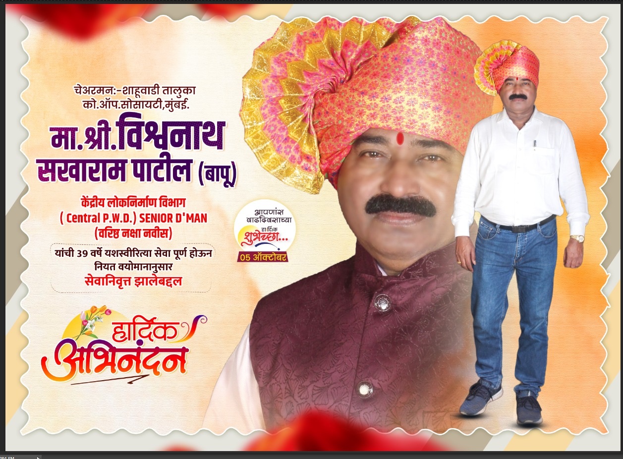 बांबवडे : शाहुवाडी तालुका को-ऑप क्रेडीट सोसायटी मुंबई चे चेअरमन तथा शाहुवाडी तालुका युथ ऑर्गनायझेशन चे खजिनदार श्री विश्वनाथ सखाराम पाटील रहाणार सोनवडे तालुका शाहुवाडी यांचा निवृत्त सोहळा दि.५ ऑक्टोबर २०२५ रोजी संपन्न होत आहे. त्यांच्या या निवृत्त सोहळ्यानिमित्त साप्ताहिक शाहुवाडी टाईम्स,एसपीएस न्यूज, दै. किल्ला या वृत्तपत्र समूहाच्या वतीने त्यांना लाख लाख शुभेच्छा .