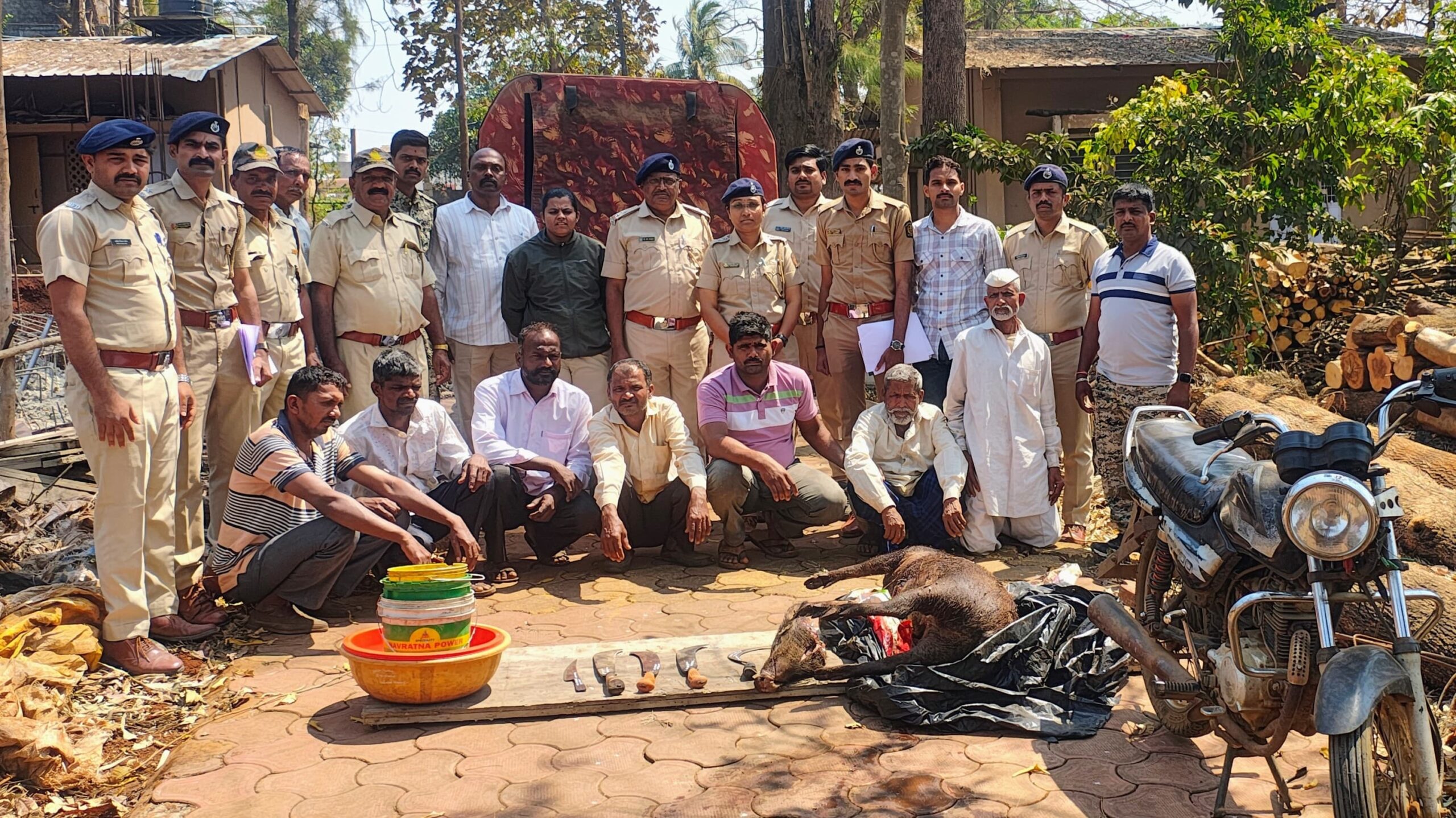उपरोक्त आरोपींकडे मृत रानडुक्कर ( धड व शीर )१, पारळी ३, विळा १, सत्तूर १, मोबाईल २,हिरोहोंडा मोटारसायकल क्र. MH 07 A 1821, बजाज सिटी १००, असा मुद्देमाल जप्त करण्यात आला आहे.