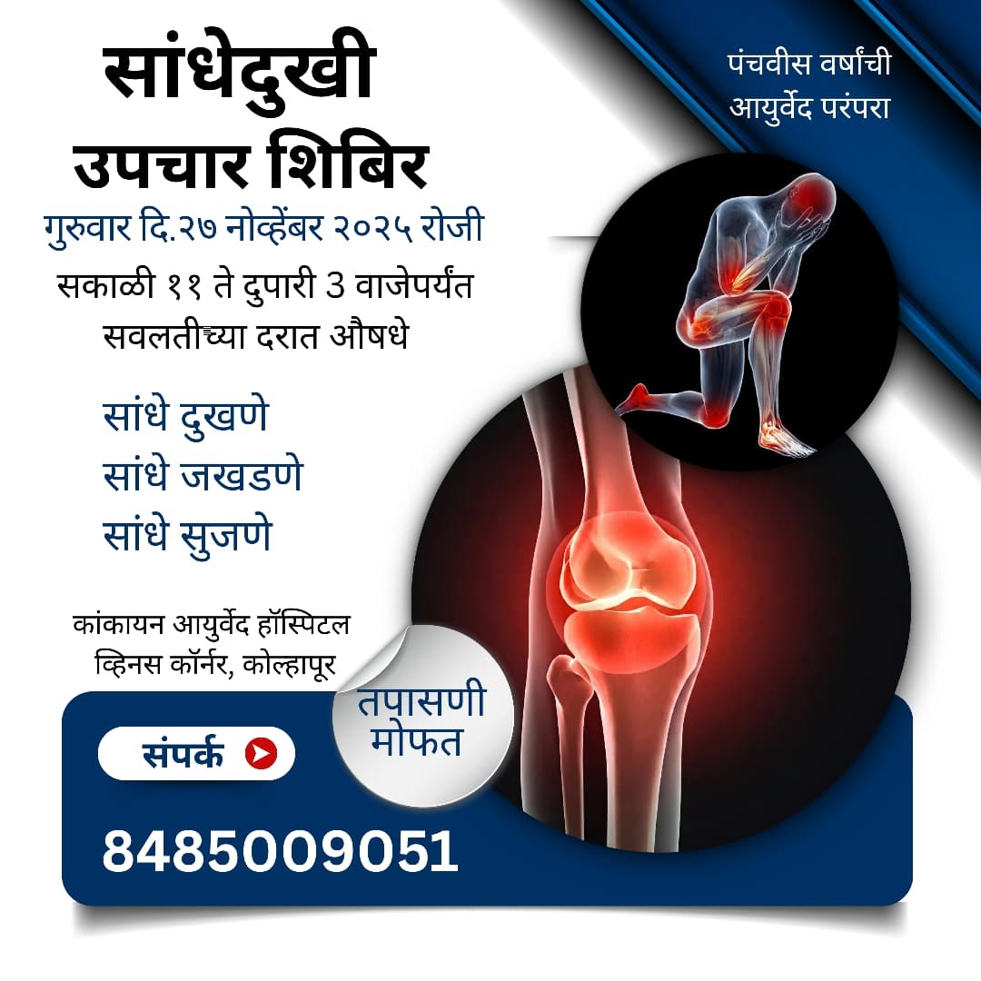 बांबवडे : कांकायान आयुर्वेद हॉस्पिटल च्या वतीने सांधे दुखी, कंबर दुखी, गुडघे दुखी , किंवा सायटिका च्या त्रासावर उपचार शिबीर आयोजित करण्यात आले आहे. दि.२०, २१, २२ या दिवशी कोल्हापूर येथील व्हीनस कॉर्नरजवळ पेंढारकर कॉम्प्लेक्स पहिला मजला कोल्हापूर इथं सकाळी ११.०० ते दुपारी ३.०० वाजेपर्यंत संपन्न होणार आहे.